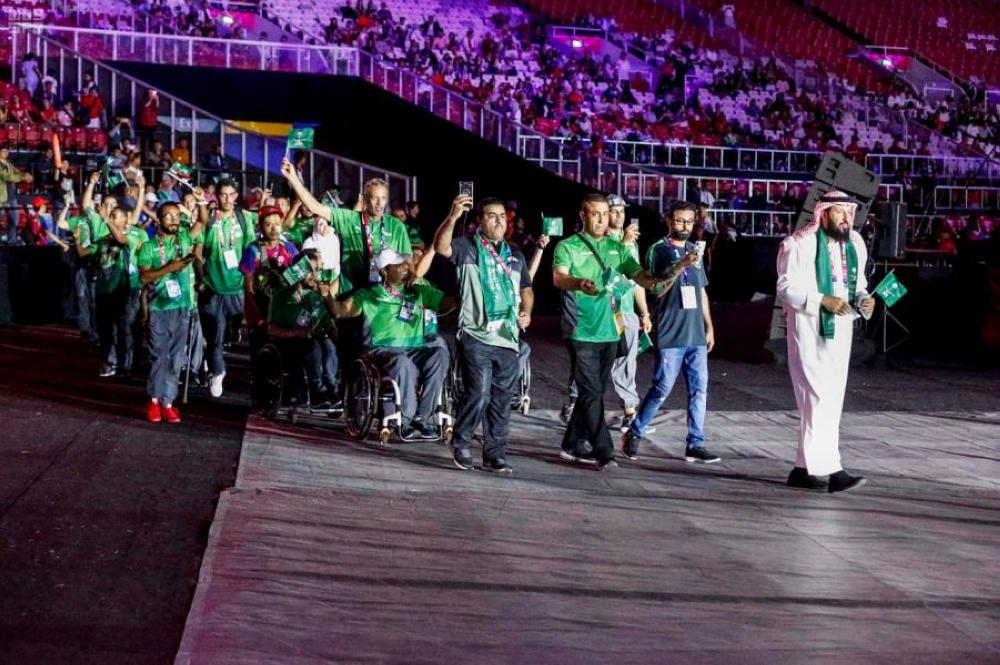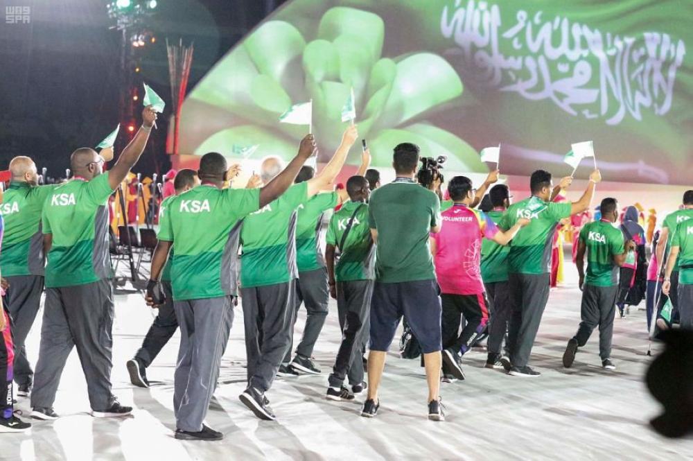 وحمل لاعب المنتخب السعودي لكرة السلة للكراسي المتحركة عبدالرحمن شعيلان علم المملكة العربية السعودية خلال مسيرة الوفد السعودي في حفل افتتاح الدورة، بمشاركة 49 شخصاً من اللاعبين والوفد الإداري والفني السعودي.