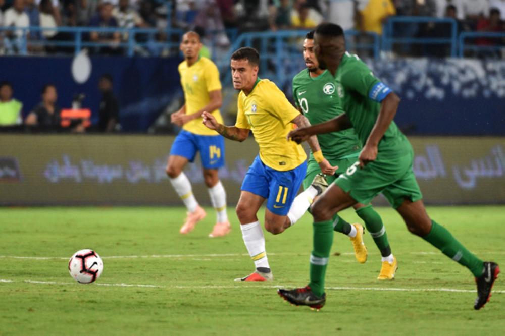 بدأ لاعبو منتخبنا اللقاء بثقة عالية تمكنوا من خلالها من مجاراة منتخب البرازيل ولعب المدرب بيتزي بطريقة 4 - 2 - 3 - 1، وفرض انتشار لاعبي الأخضر في الملعب ولم يعتمد على الطريقة الدفاعية فتمكن منتخبنا من تبادل الهجمات مع منتخب البرازيل وإن كان يعاب على تشكيلة بيتزي عدم وجود رأس حربة تقليدي، ومع ذلك سنحت فرصتان لسالم الدوسري ولكنه سددها في الدفاع البرازيلي، كما تألق الحارس محمد العويس في إنقاذ مرمى الأخضر السعودي من تسديدة نيمار ورأسية جيسوس الخطرة، وفي الدقيقة 43 تمكن جيسوس من تسجيل الهدف الأول للبرازيل بعد تمريرة ماكرة من نيمار واجه جيسوس الحارس العويس ووضعها على يمينه هدفاً أولاً للبرازيل.