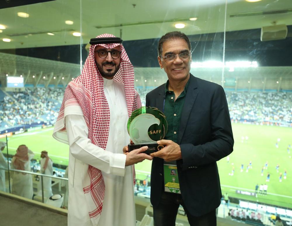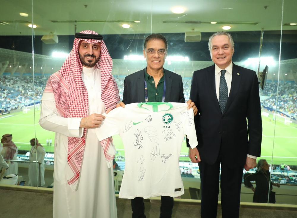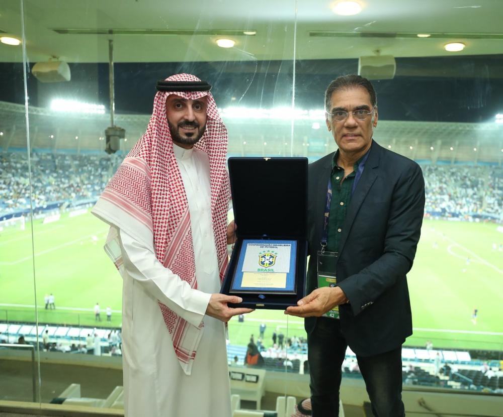 سلَّم رئيس الاتحاد السعودي لكرة القدم قصي الفواز، قميص المنتخب الوطني ممهوراً بتوقيع اللاعبين إلى رئيس بعثة منتخب البرازيل فرانشيسكو ديسيكا.