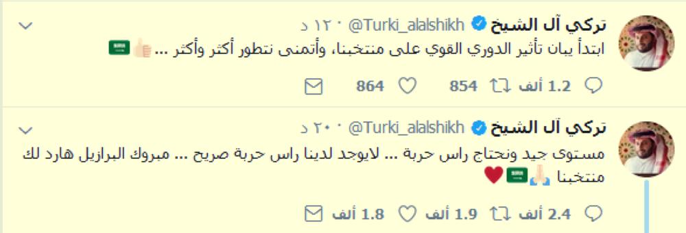 امتدح رئيس الهيئة العامة للرياضة المستشار تركي آل الشيخ، مستوى المنتخب السعودي في مباراته الودية أمام نظيره البرازيلي ضمن الدورة الرباعية الودية «سوبر كلاسيكو» التي انتهت لصالح السامبا بهدفين دون رد، وذلك على موقع التواصل الاجتماعي تويتر؛ إذ قال: «ابتدأ يبان تأثير الدوري القوي على منتخبنا، وأتمنى أن نتطور أكثر وأكثر.. مستوى جيد ونحتاج رأس حربة.. لا يوجد لدينا رأس حربة صريح.. مبروك البرازيل هارد لك منتخبنا».