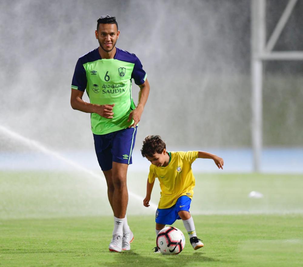 لاعب وسط الأهلي «دي سوزا» أثناء التدريبات اللياقية بينما ابنه يداعب الكرة. (تصوير: المركز الإعلامي للنادي الأهلي)