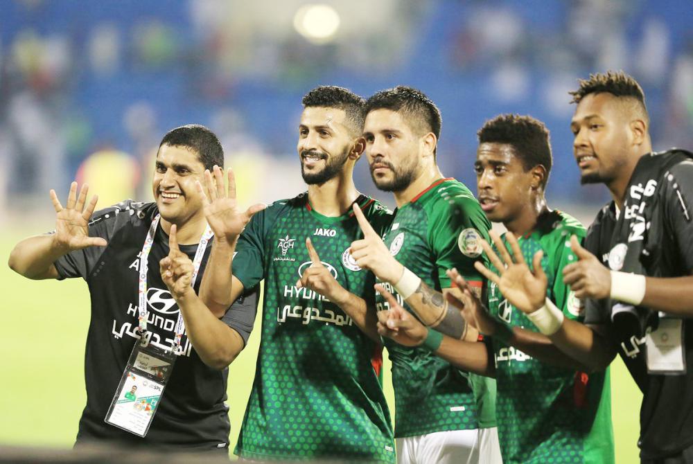 لاعبو الاتفاق يحتفلون بالسداسية التي هزت شباك الأهلي، في إطار الجولة السادسة من دوري المحترفين.