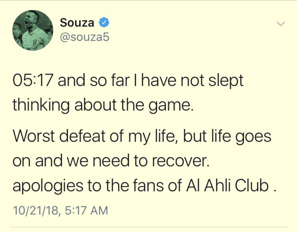 وقدم دي سوزا الاعتذار لجماهير الأهلي عن الخسارة الثقيلة التي لم يتمكن من النوم بسبب التفكير فيها، معتبرا أن الفريق بحاجة لاستعادة قوته والعودة من جديد للمنافسة.