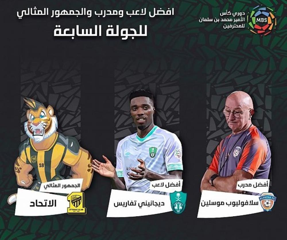وحصل مدرب فريق الفيحاء «الصربي» سلافيوليوب موسلين على جائزة رابطة الدوري السعودي للمحترفين لأفضل مدرب، فيما نال لاعب الأهلي ديجانيني تفاريس على جائزة أفضل لاعب وذلك في منافسات الجولة السابعة من دوري كأس الأمير محمد بن سلمان للمحترفين لكرة القدم.