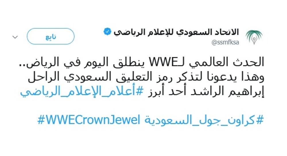 وكان اتحاد الإعلام الرياضي، نشر تغريدة على موقعه في «تويتر» مذكرا بالمعلق الشهير، حيث كتب: «الحدث العالمي لـWWE ينطلق اليوم في الرياض، وهذا يدعونا لتذكر رمز التعليق السعودي الراحل إبراهيم الراشد أحد أبرز أعلام الإعلام الرياضي».