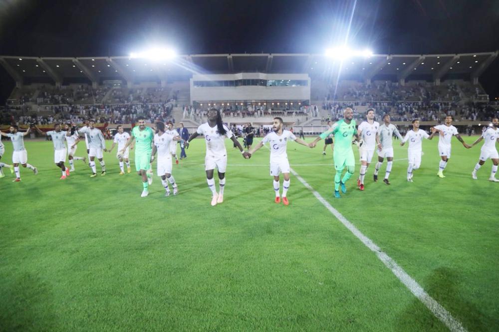 لاعبو الهلال يحتفلون بعد الفوز على القادسية.