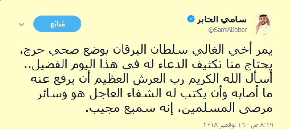 طالب سامي الجابر ممثل السعودية في الفيفا، ومساعد رئيس اتحاد التضامن الإسلامي والاتحاد العربي لكرة القدم، من الوسط الرياضي الدعاء والتضامن مع اللاعب السابق لنادي الهلال سلطان البرقان، الذي يمر بوضع صحي حرج، وقال الجابر عبر حسابه في موقع التواصل الاجتماعي «تويتر»: «يمر أخي الغالي سلطان البرقان بوضع صحي حرج، يحتاج منا تكثيف الدعاء له في هذا اليوم الفضيل»، وأضاف «أسأل الله الكريم رب العرش العظيم أن يرفع عنه ما أصابه وأن يكتب له الشفاء العاجل هو وسائر مرضى المسلمين، إنه سميع مجيب».