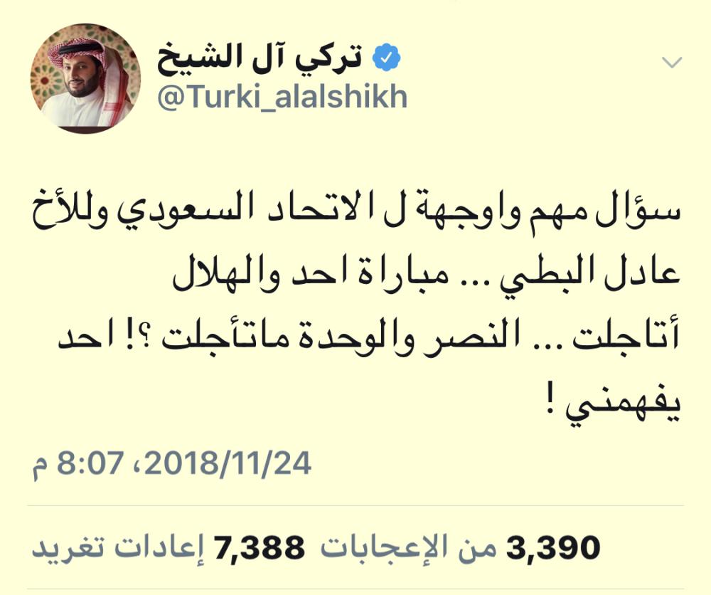 رفض رئيس لجنة المسابقات بالاتحاد السعودي لكرة القدم عادل البطي الإجابة على سؤال «عكاظ» حول مضمون رده على تساؤل رئيس هيئة الرياضة تركي آل الشيخ عبر حسابه في «تويتر»: «سؤال مهم أوجهه للاتحاد السعودي وللأخ عادل البطي مباراة أحد والهلال أتاجلت، النصر والوحدة ما تأجلت؟! أحد يفهمني!». وتعذر البطي عن الإجابة بالانشغال بملفات مهمة، طالبا معاودة الاتصال في وقت لاحق، لكنه أجاب، بعد إلحاح من المحرر بضرورة الإجابة على تساؤلات رئيس هيئة الرياضة، بقوله: «اسأله هو».