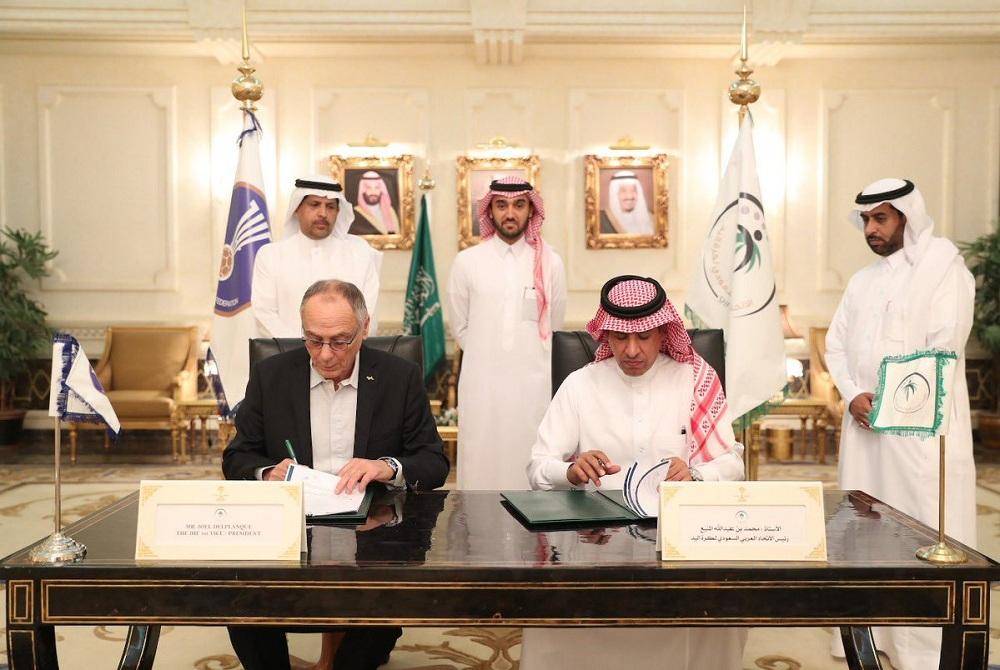 ووقع رئيس الاتحاد السعودي لكرة اليد محمد المنيع مع النائب الأول لرئيس الاتحاد الدولي للعبة جويل ديلبلانك اليوم في مقر الهيئة العامة للرياضية بمجمع الأمير فيصل بن فهد الأولمبي بالرياض وبحضور نائب رئيس مجلس إدارة الهيئة العامة للرياضة الأمير عبدالعزيز بن تركي الفيصل عقد الاستضافة.