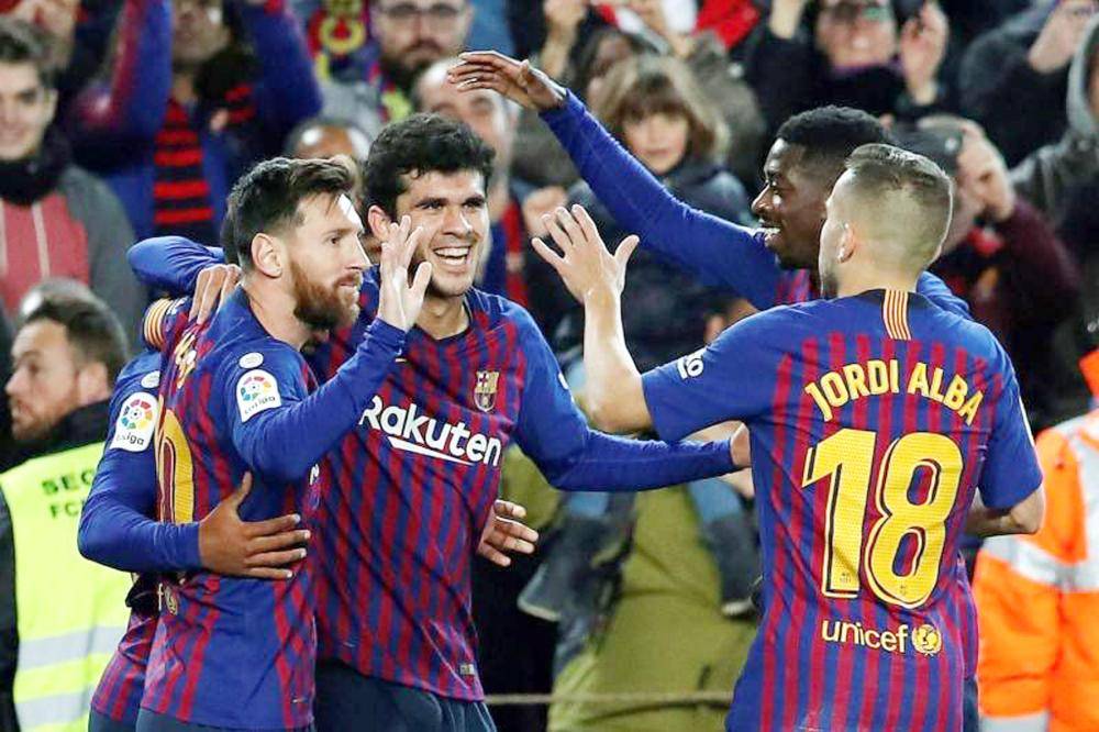 فرحة لاعبي برشلونة بالفوز على فياريال في الدوري الإسباني.