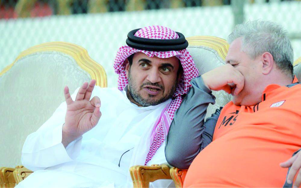 حديث جانبي بين رئيس الشباب خالد البلطان ومدرب الفريق سوموديكا.