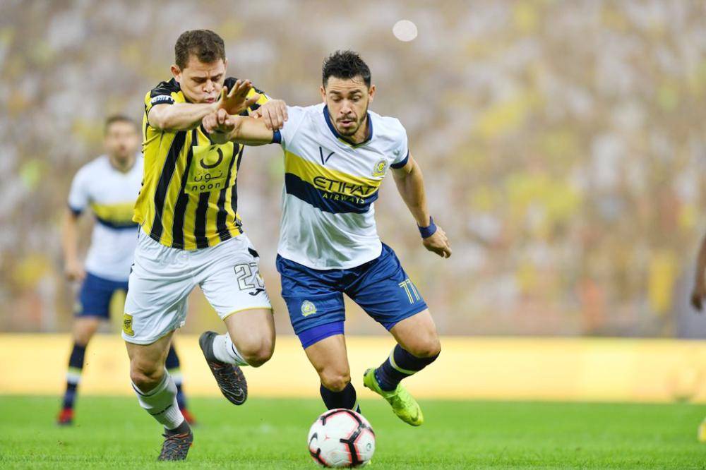 صراع على الكرة بين لاعب النصر جوليانو والاتحاد جوناس.