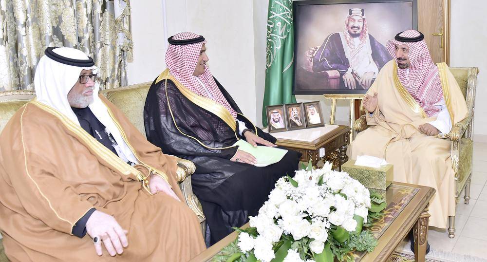 جلوي بن عبدالعزيز مستقبلا رئيس وأعضاء نادي تجران. (عكاظ)
