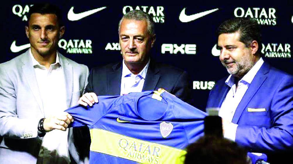 ألفارو (وسط) يحمل قميص بوكا بعد توقيعه رسميا لتدريبه. (عكاظ)