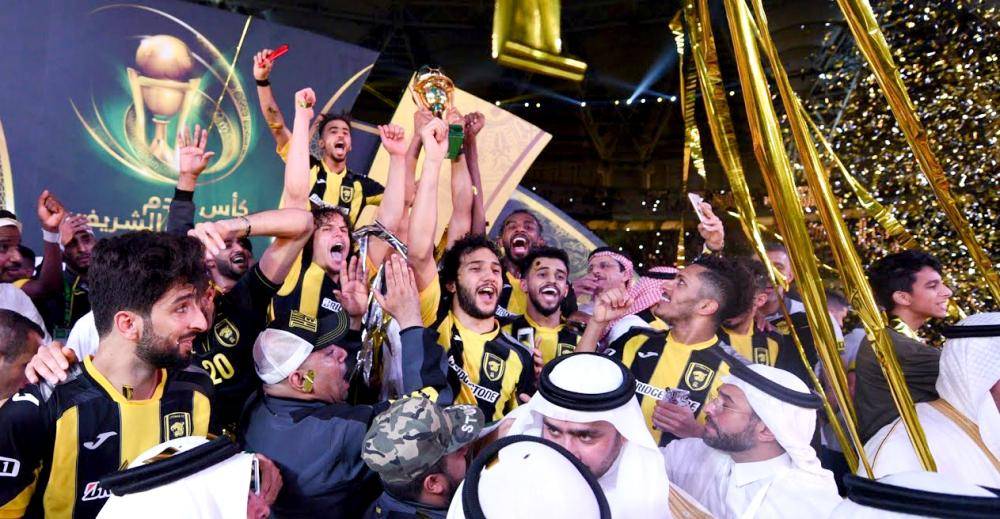 لاعبو الاتحاد يحتفلون بلقب كأس الملك بعد فوزهم على الفيصلي في النهائي 3-1. (عكاظ)
