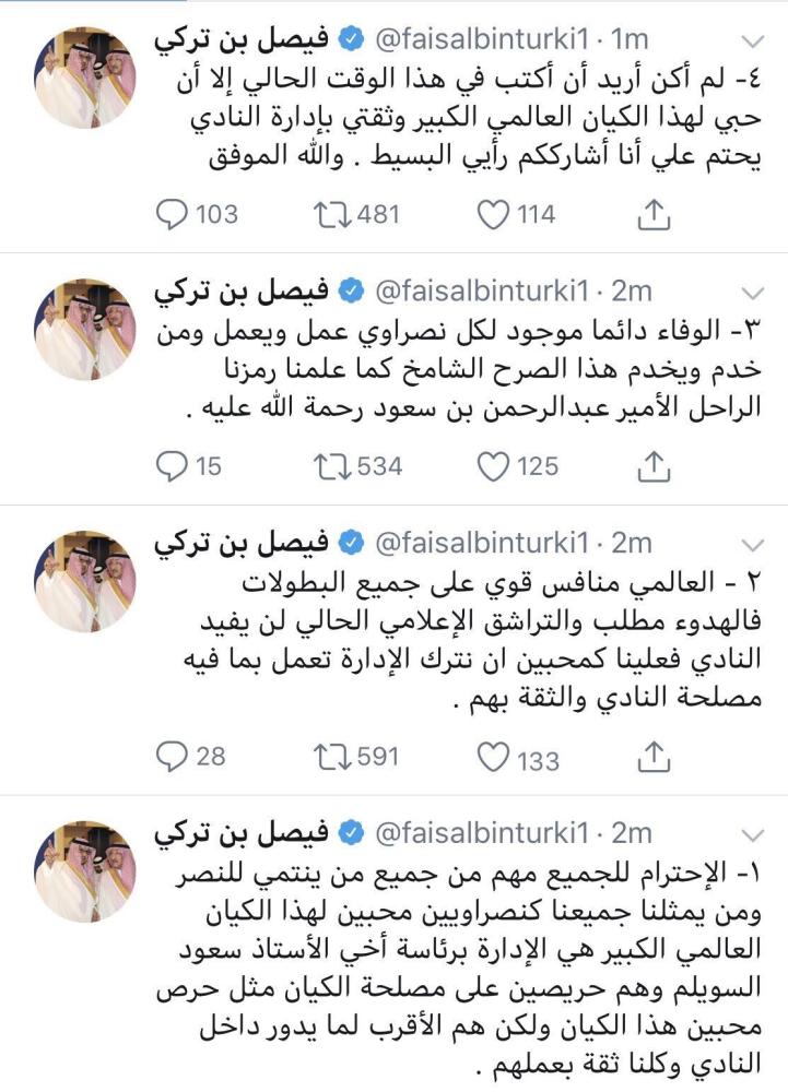 من جانب آخر وفي خضم الأحداث والتراشقات الجماهيرية النصراوية ما بين مؤيد ومعارض خرج رئيس النصر السابق الأمير فيصل بن تركي بأربع تغريدات ساهمت بشكل كبير في إطفاء نيران تغريدة الأسطورة ماجد عبدالله، وقال: «الاحترام للجميع مهم من جميع من ينتمي للنصر، ومن يمثلنا جميعنا كنصراويين محبين لهذا الكيان العالمي الكبير، الإدارة الحالية برئاسة سعود آل سويلم حريصة على مصلحة الكيان مثل حرص محبي هذا الكيان ولكن هم الأقرب لما يدور داخل النادي وكلنا ثقة بعملهم».