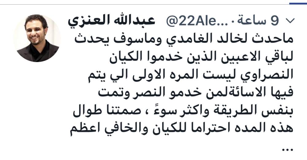 وعلى الصعيد ذاته وبعد ساعات من تغريدة الكابتن ماجد عبدالله، طرح الحارس النصراوي عبدالله العنزي تغريدة قال فيها: «ما حدث لخالد الغامدي وما سيحدث لباقي اللاعبين الذين خدموا الكيان النصراوي ليست المرة الأولى اللي يتم فيها الإساءة لمن خدموا النصر وتمت بنفس الطريقة وأكثر سوءا، صمتنا طوال هذه المده احتراما للكيان والخافي أعظم».