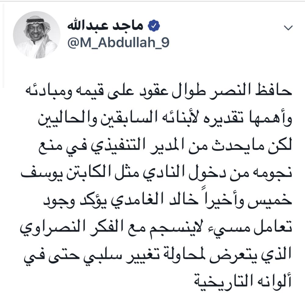 أشعل أسطورة نادي النصر ماجد أحمد عبدالله البيت النصراوي، بعد أن وجه رسالة لإدارة العالمي برئاسة سعود آل سويلم، قال فيها: «حافظ النصر طوال عقود على قيمه ومبادئه، وأهمها تقديره لأبنائه السابقين والحاليين، لكن ما يحدث من المدير التنفيذي في منع نجومه من دخول النادي، مثل الكابتن يوسف خميس، وأخيراً خالد الغامدي، يؤكد وجود تعامل مسيء لا ينسجم مع الفكر النصراوي الذي يتعرض لمحاولة تغيير سلبي حتى في ألوانه التاريخية».