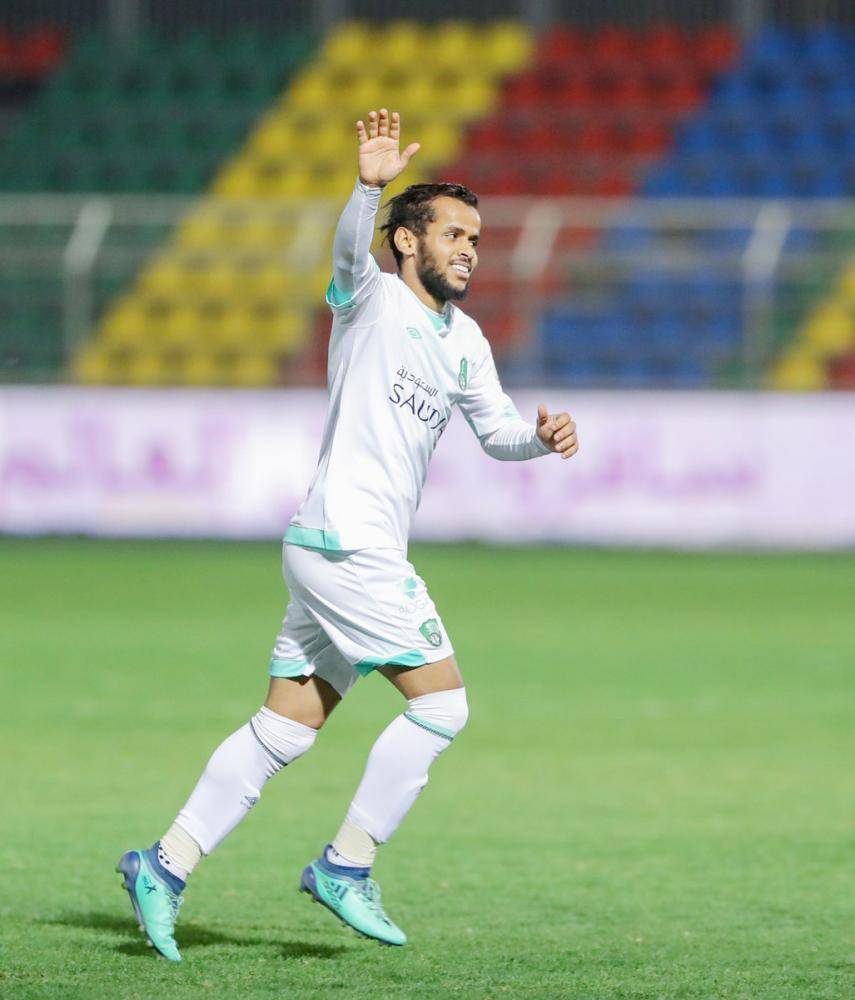 عبدالفتاح عسيري فرحا بهدفه في مرمى الباطن.