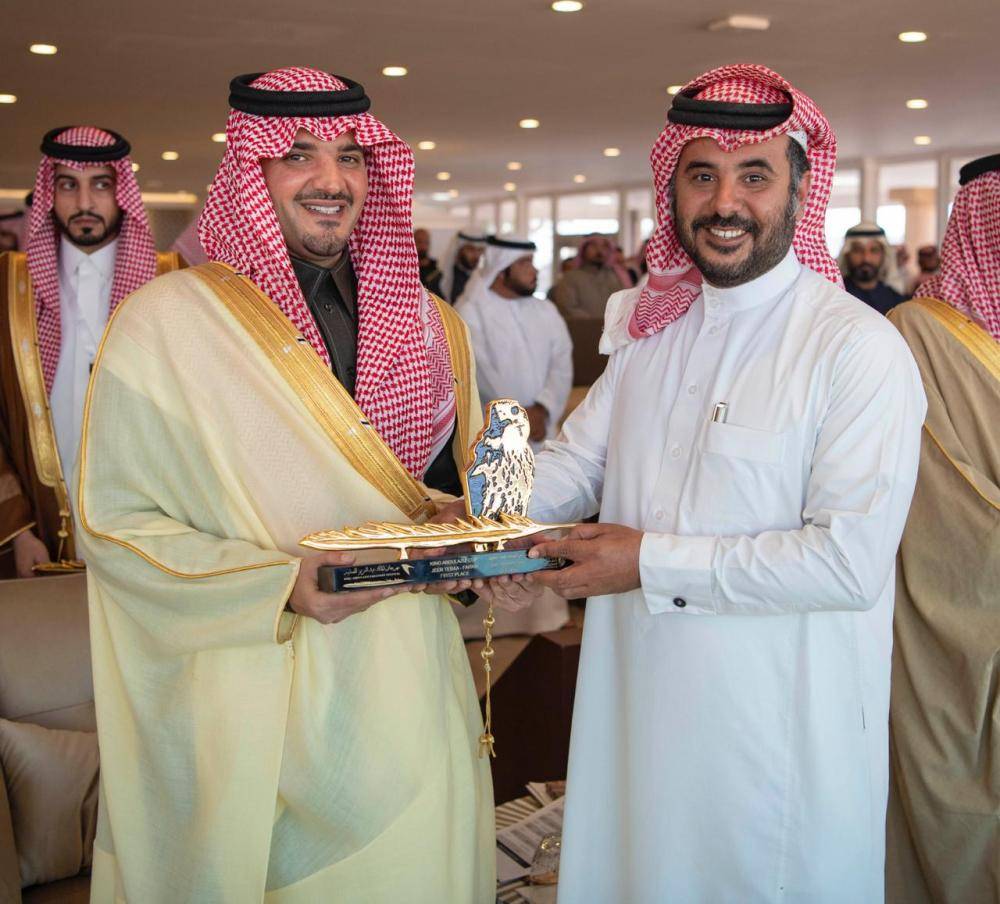 إثر ذلك سلم الأمير عبدالعزيز بن سعود بن نايف بن عبدالعزيز ، الفائزين بالأشواط الختامية بالمسابقة كؤوس الملك عبدالعزيز لفئات الصقور المشاركة في المهرجان .