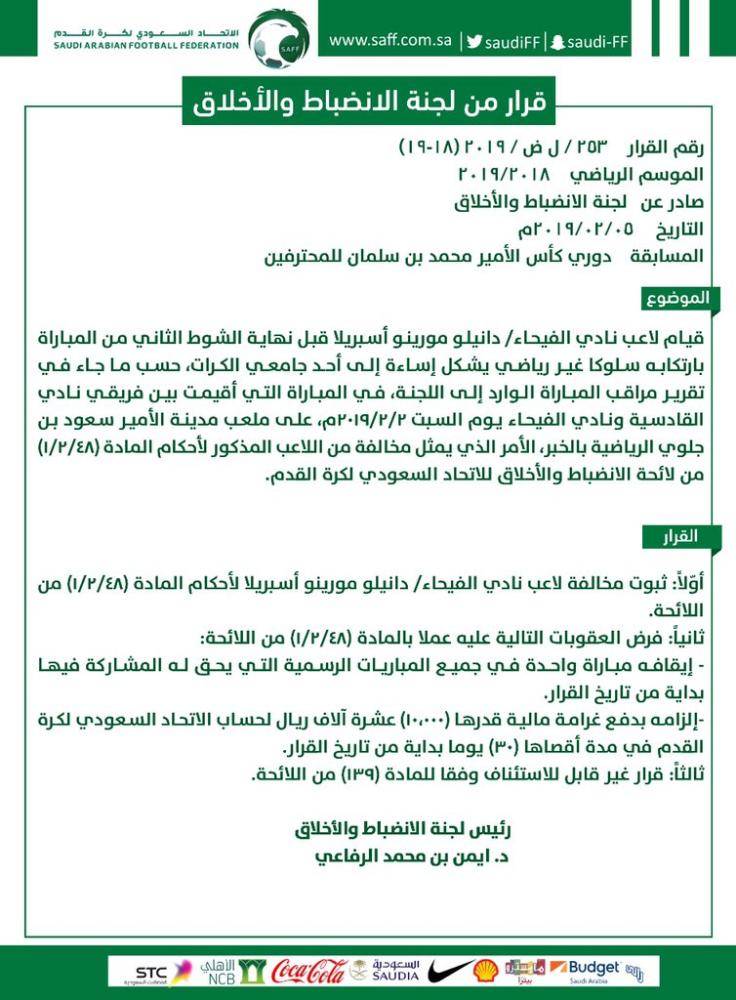 أوقفت لجنة الانضباط والأخلاق بالاتحاد السعودي لكرة القدم، 4 لاعبين 11 مباراة وغرمتهم 70 ألف ريال؛ لارتكابهم مخالفات أثناء مباريات فرقهم في الجولة الـ18 من دوري كأس الأمير محمد بن سلمان للمحترفين لكرة القدم. و اللاعبون الـ4 هم؛ سلطان الغنام من النصر (مباراتين)، وبرايان أليمان من الاتفاق (5 مباريات)، ومحمد مجرشي من أحد (3 مباريات)، وأسبريلا من الفيحاء (مباراة)، لمخالفتهم المادة (4813) من اللائحة، إذ قام الغنام بـ«دعس» قدم لاعب منافس، فيما استخدم أليمان والمجرشي قوة مفرطة ليصيبا لاعبي الفريق المنافس في منطقة حساسة، وأخيرا عاقبت اللجنة أسبريلا لارتكابة سلوكا غير رياضي ضد جامعي الكرات.