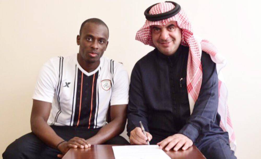 أسبريلا عقب التوقيع لنادي الشباب أمس.