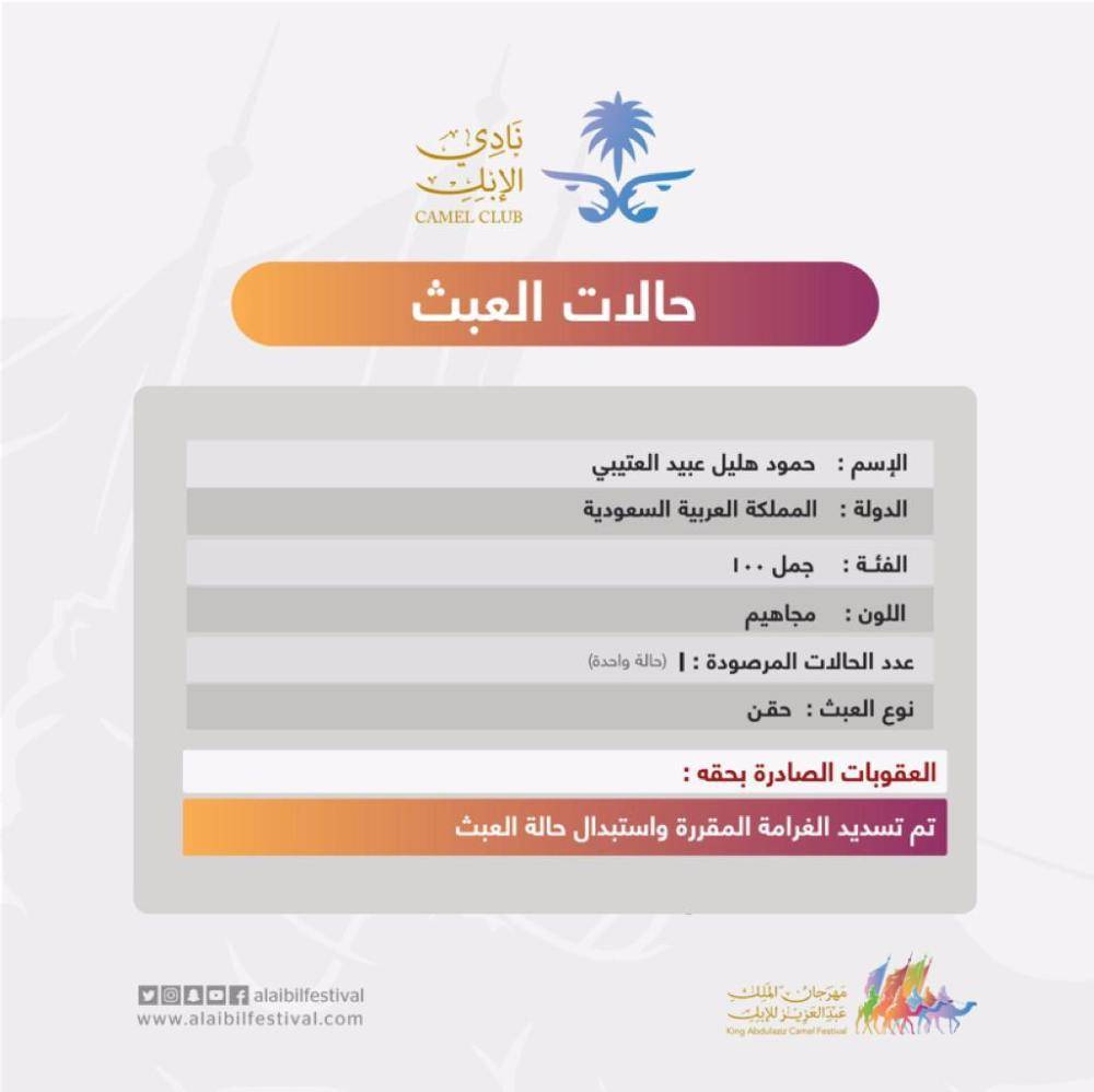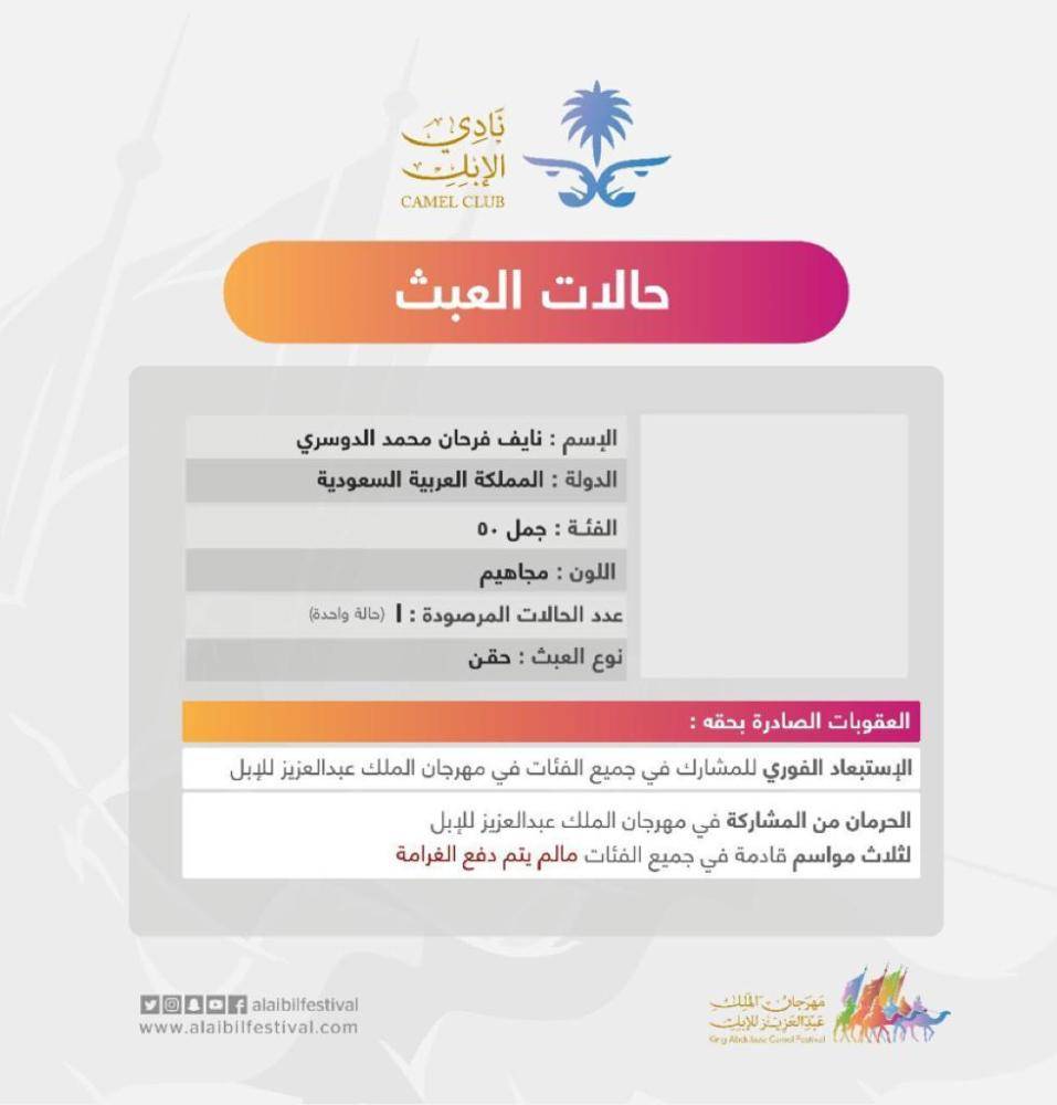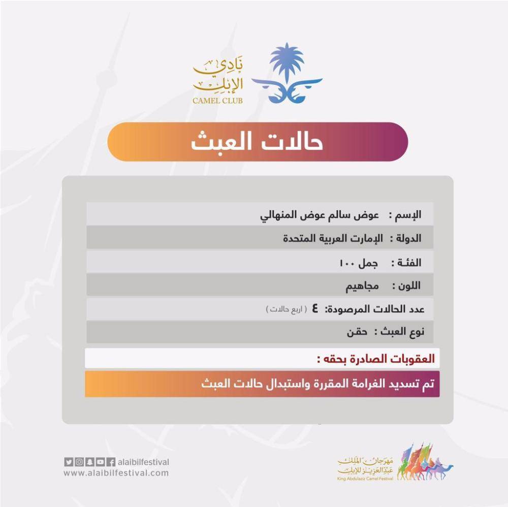 أعلنت لجنة الجزاءات والعقوبات بمهرجان الملك عبدالعزيز للإبل استبعاد 5 مشاركين من المنافسة في جميع الفئات، مع حرمانهم من المشاركة في المهرجان لمدة ثلاثة مواسم، وذلك ما لم يتم تسديد الغرامة المطلوبة.