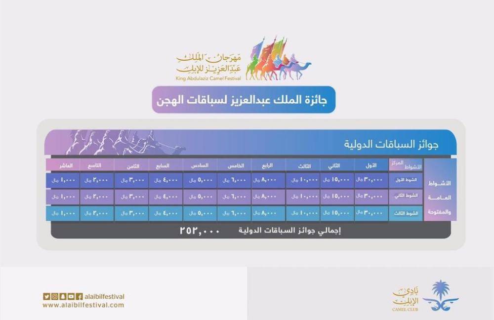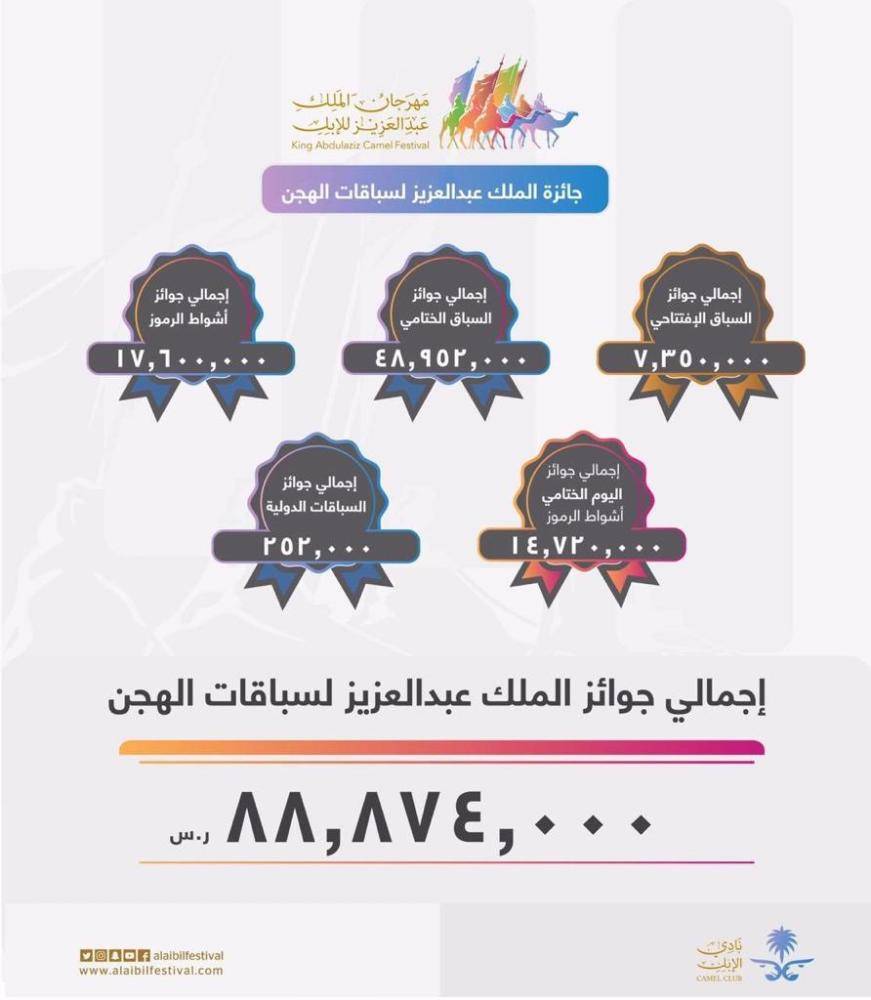 أعلنت إدارة نادي الإبل اليوم (الأحد) مجموع جوائز سباقات الهجن المقامة ضمن مهرجان الملك عبدالعزيز للإبل في الصياهد الجنوبية شمال شرقي العاصمة الرياض، وذلك بمجموع جوائز يزيد على 88 مليون ريال.