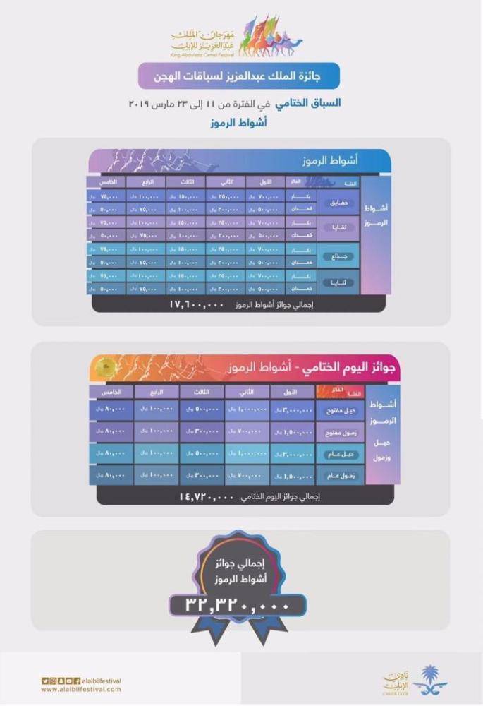 وأعلن نادي الإبل عبر حسابه الرسمي في «تويتر» الذي أعلن عبره كافة تفاصيل جوائز سباقات الهجن، أن الفائزين بجوائز اليوم الختامي وتحديداً في أشواط الرموز، سيحصل الأول في شوطي الحيل المفتوح والعام على مبلغ 3 ملايين ريال، فيما سيحصل الأول في شوطي الزمول المفتوح والعام على مليون ونصف مليون ريال، وتتدرج مبالغ الجوائز حتى المركز الخامس الذي سيحصل على 80 ألف ريال سعودي.