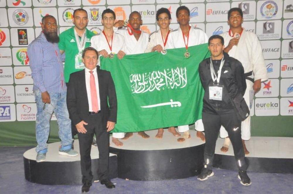بعثة المنتخب السعودي للجودو لحظة تتويجها في بطولة أفريقيا المفتوحة.