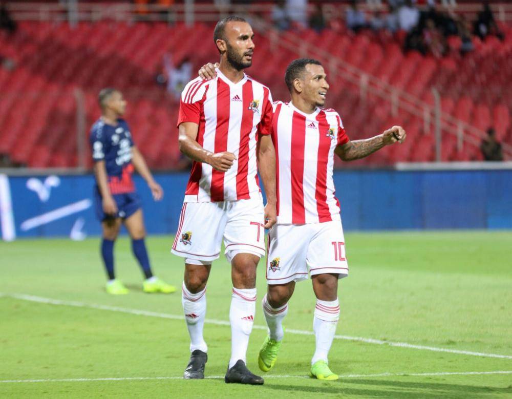 الجبالي وأومتيرو يحتفلان بأحد أهدافهما في مرمى الاتفاق أمس