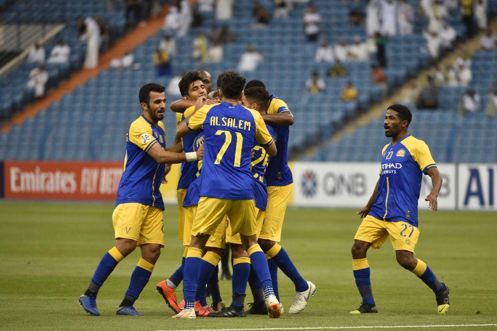 Nassr's players celebrate their goal during the AFC Champions League group A football match between Saudi's Al Nassr and Iraq's Al Zawraa at the King Fahd International Stadium in the Saudi capital Riyadh on April 8, 2019.