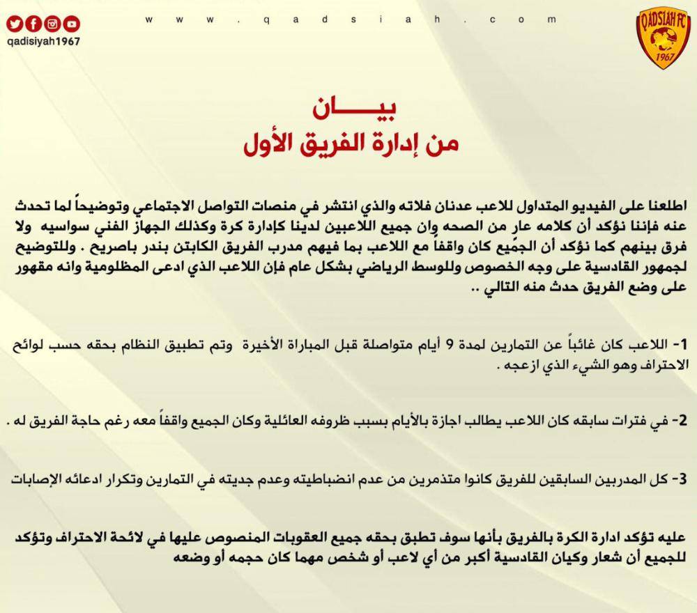 وأوضحت الإدارة في بيانها الذي خاطبت فيه جمهور القادسية على وجه الخصوص والوسط الرياضي بشكل عام، بأن اللاعب الذي ادعى المظلومية وأنه مقهور على وضع الفريق حدث منه التالي، اللاعب كان غائبا عن التمارين لمدة 9 أيام متواصلة قبل المباراة الأخيرة وتم تطبيق النظام بحقه حسب لوائح الاحتراف وهو الشيء الذي أزعجه، خلال فترات سابقة كان اللاعب يطالب بإجازة بسبب ظروفه العائلية وكان الجميع واقفا معه على الرغم من حاجة الفريق إليه، كل المدربين السابقين للفريق كانوا متذمرين من عدم انضباطيته وعدم جديته في التمارين وتكرار ادعائه الإصابات.