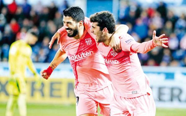 احتفالية خاصة للاعبي برشلونة في مباراة ديبورتيفو ألافيس في الدوري الإسباني أمس الأول.