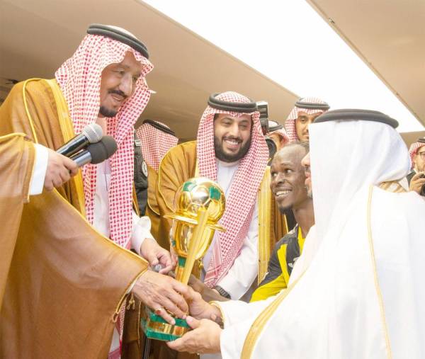 الملك سلمان بن عبدالعزيز يسلم قائد فريق الاتحاد السابق عدنان فلاتة الكأس الغالية الموسم الماضي.