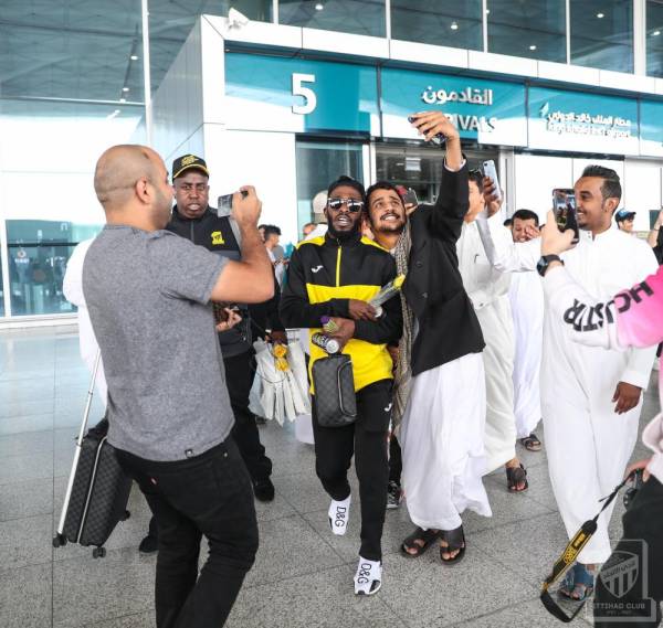 أحد الجماهير الاتحادية يلتقط سيلفي مع فهد المولد عقب وصوله للرياض أمس.