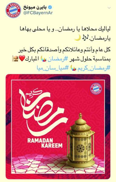 ونشرت حسابات الأندية الأوروبية الكبيرة أيضاً تهنئة بالشهر الفضيل أبرزها ريال مدريد وبرشلونة وبايرن ميونيخ وغيرها من الأندية. ونشر باريس سان جيرمان فيديو للاعبي الفريق وهم يهنئون المسلمين بعبارة «رمضان مبارك» في مقدمتهم البرازيلي نيمار.