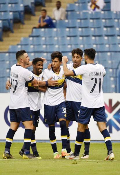 فرحة لاعبي النصر بالتسجيل في مرمى الوصل.
