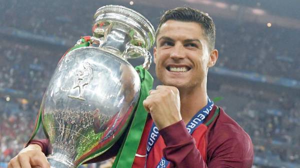 كريستيانو رونالدو يحمل كأس البطولة الأوروبية.