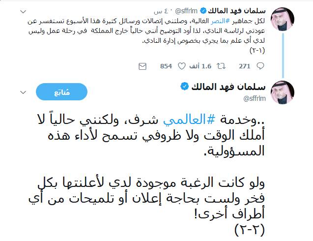 قال رئيس النصر السابق سلمان المالك إن خدمة «العالمي» شرف يتمناه كل نصراوي، إلا أنه لا يملك الوقت حاليا للإشراف على النادي ومسؤولياته. وأضاف المالك في تغريدة على حسابه الشخصي في «تويتر»: «لكل جماهير النصر الغالية، وصلتني اتصالات ورسائل كثيرة هذا الأسبوع تستفسر عن عودتي لرئاسة النادي، لذا أود التوضيح أنني حالياً خارج المملكة في رحلة عمل وليس لدي أي علم بما يجري بخصوص إدارة النادي»، مضيفا: «خدمة العالمي شرف، ولكنني حالياً لا أملك الوقت ولا ظروفي تسمح لأداء هذه المسؤولية، ولو كانت الرغبة موجودة لدي لأعلنتها بكل فخر ولست بحاجة إعلان أو تلميحات من أي أطراف أخرى».