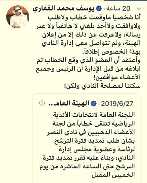 وكانت أزمة كرسي الرئاسة في نادي النصر قد تصاعدت خلال اليومين الماضيين بعد تراجع عدد من قائمة الشرفيين الذهبية، وامتناعهم عن التصويت للمرشحين الحاليين. وعلمت «عكاظ» بأن هذا الموقف جاء بناء على معلومات نقلت لهم بأن سعود آل سويلم طلب منهم عدم التصويت لأي من المرشحين، ليكتشفوا في ما بعد عكس ذلك، بعد أن نفى آل سويلم لأحد الأعضاء ذلك الأمر، مؤكدا أنه بعيد عما يدور في النادي بعد اعتذاره عن الترشح للفترة القادمة، بسبب انشغاله الأيام الماضية مع والده الذي انتقل إلى رحمة الله، الأمر الذي أثار غضب الذهبيين، ليعقبه اجتماع عقد أمس الأول للخروج بقرار يخدم مصلحة النصر.