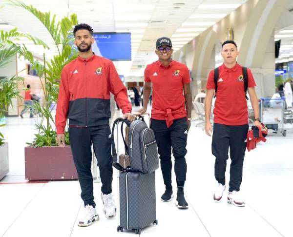 الثلاثي البرازيلي قاليمي، وانسلمو، وريناتو أثناء مغادرتهم مطار جدة.