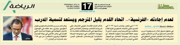 وكانت «عكاظ» أشارت في خبر سابق إلى استغناء اتحاد القدم عن مترجم المنتخب أيمن عبيد لعدم إجادته اللغة الفرنسية، إضافة إلى تلميحات المدرب الفرنسي بتوقيعه مع الأخضر في تغريدة سابقة له.