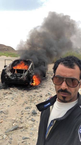 وتوجه السائق السعودي فرحان الرمالي وملاحه ماجد الشمري بالشكر إلى الله بعدما نجيا إثر احتراق سيارته بسبب تماس كهربائي.