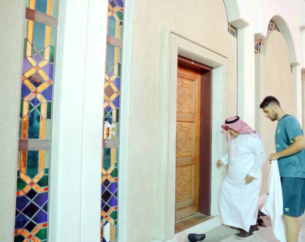 الأمير منصور بن مشعل واللاعب البوسني لحظة دخولها المسجد لاداء الصلاة .