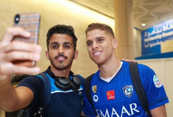 مشجع هلالي يلتقط «سليفي» مع اللاعب جوستافو كويلار في مطار الملك خالد الدولي.