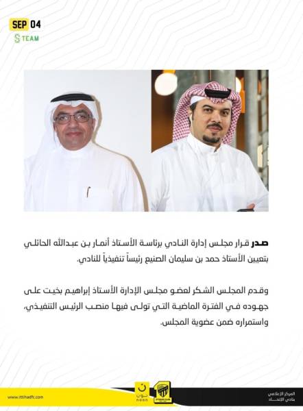 أصدر رئيس نادي الاتحاد أنمار الحائلي قرارا بتعيين حمد الصنيع رئيسا تنفيذيا للنادي، وقدم الحائلي شكره لعضو مجلس الإدارة إبراهيم بخيت على جهوده في الفترة الماضية التي قام بها في منصب الرئيس التنفيذي للنادي، واستمراره ضمن عضوية مجلس الإدارة الحالي.