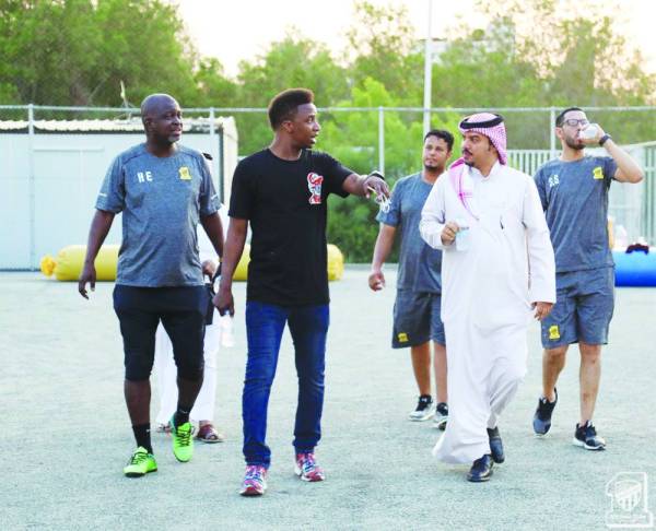 الصنيع ونور وإدريس خلال حضورهم تدريبات الفئات السنية.