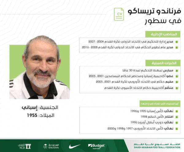 عين الاتحاد السعودي لكرة القدم، الإسباني فرناندو تريساكو (64 عاماً) رئيساً للجنة الحكام في الاتحاد، ويأتي قرار تعيين الإسباني فرناندو تريساكو نظير خبراته العملية السابقة وما يملكه من سيرة ذاتية وخبرة في مجال التحكيم لأكثر من 30 عاماً، وتولى «تريساكو» عدداً من المناصب الإدارية في الفيفا منها مدير إدارة التحكيم 2004 ـ 2007، ومدير عام تطوير الحكام 2008 ـ 2016، كما عمل مقيماً لحكام الاتحاد الأوروبي 2001 ـ 2003، إضافة إلى تنظيمه أكاديمية حكام الاتحاد الآسيوي.