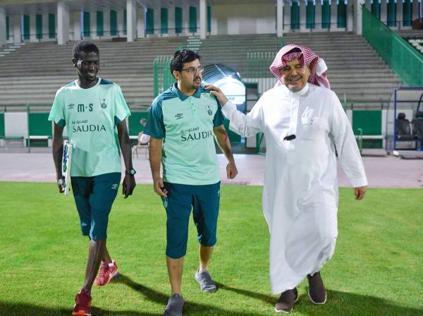 الأمير منصور بن مشعل في لقطة تشجيعية للمدرب المحمدي.
